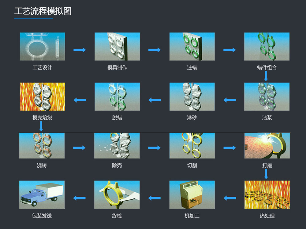 熔模鑄造工藝包括幾個步驟:金屬模具制造,蠟?zāi)Ia(chǎn),模殼制造,澆鑄,清砂切割, 打磨精整。