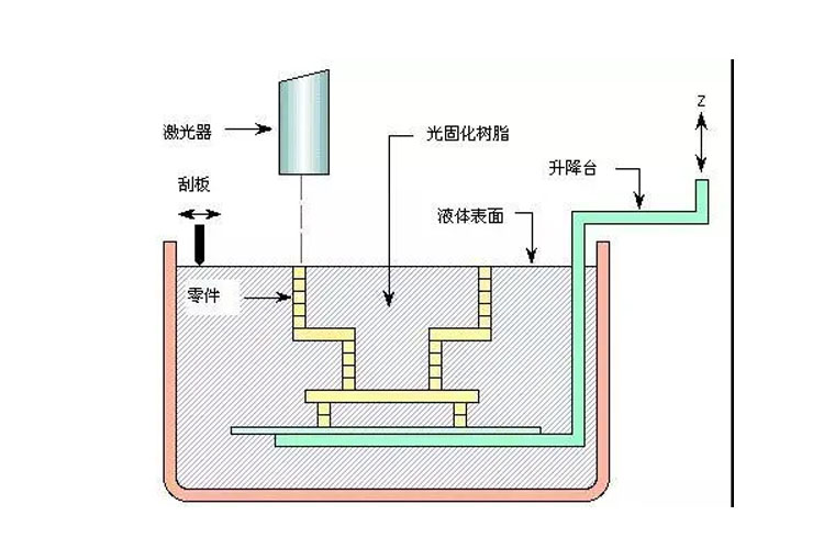 打印之前在樹(shù)脂槽中盛滿(mǎn)液態(tài)光敏樹(shù)脂,可升降工作臺(tái)處于液面下一個(gè)截面層厚的高度,聚焦后的激光束在計(jì)算機(jī)控制下沿液面進(jìn)行掃描,被掃描的區(qū)域樹(shù)脂固化,從而得到該截面的一層樹(shù)脂薄片;升降工作臺(tái)下降一個(gè)層厚距離,液體樹(shù)脂再次暴露在光線(xiàn)下,再次掃描固化,如此重復(fù),直到整個(gè)產(chǎn)品成型;升降臺(tái)升出液體樹(shù)脂表面,取出工件,進(jìn)行相關(guān)后處理,通過(guò)強(qiáng)光、電鍍、噴漆或著色等處理得到需要的最終產(chǎn)品。