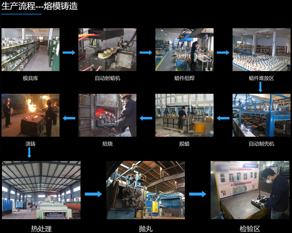 熔模鑄造工藝包括幾個步驟:金屬模具制造,蠟?zāi)Ia(chǎn),模殼制造,澆鑄,清砂切割, 打磨精整。